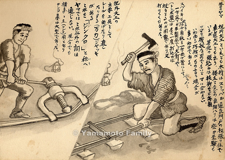 昔のヤマ(坑内大工 - レール曲げ 犬釘打ち)