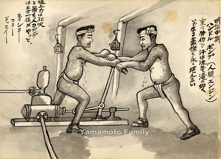 ハンドルポンプ(人間エンジン)重々労働で汗は流れて滝の如く いかなる豪傑も永く堪えない。吸上力は32呎と雖も人力ポンプは三分の一位がやっと。 ヨイシヨー コラー ドッコイー