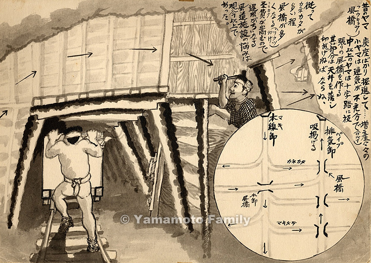 炭座ばかり掘進して・・・・・増産々々の小ヤマは通気が不充分で(ワルイ) 中以上のヤマは十字路に板張りの風橋を作る 其部分は天井を落し 切あげねばならぬ。従ってカネカタが多い程 風橋が多くなる(リクツわけ)。トニカク経費が嵩むので遅れがちになる 風道施設の悩みは現今以上であった。