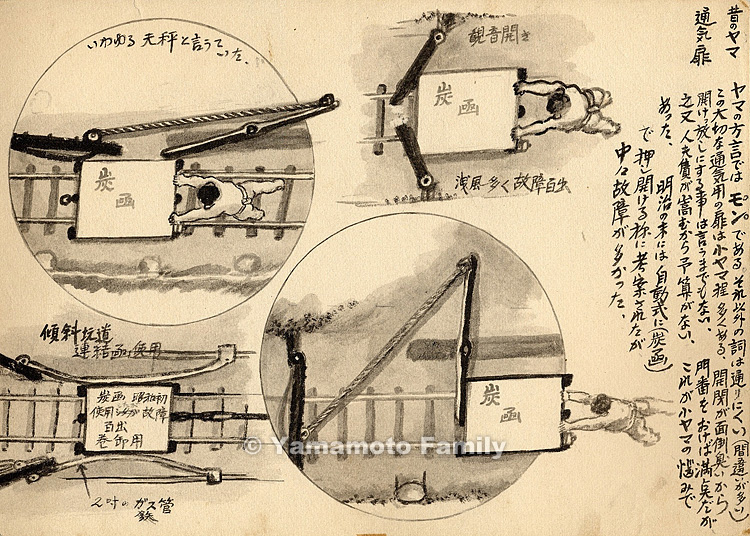 ヤマの方言ではモンである。それ以外の訶ば通りにくい(間違いが多い)。この大切な通気用の扉は小ヤマ程多くある。開閉が面倒臭いから開けっ放しにする事は言うまでもない。門番をおけば満点だが、之又人夫賃が嵩むから予算がない。これが小ヤマの悩みであった。明治の末には自動式に(炭函)で押し開ける様に考案されたが、中々故障が多かった。