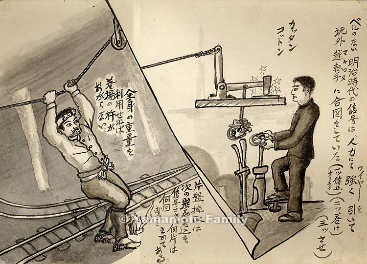 ベルのない明治時代の信号は、入力にてワイヤーを強く引いて坑外運転手に合図をしていた。(一ツ 停止・オーライ)(二ツ 巻け)(三ツ させ) 片盤棹取は次の炭函差込を信号する。何片は何回曳くときめてある。全身の重量を利用せねば巻場の杵があがらない。