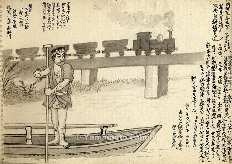 廿七、八年頃より舟多きに非ず、汽車のために舟をヤマに乗りあげる人が続いた。もとより体力腕っ節も強いので、直ちにヤマのゲザイ人に馴こむのも速かった。当時、舟頭の愚智こぼし。あゝ、オカジョーキのために、おいらの飯茶碗は愈々叩き落された。