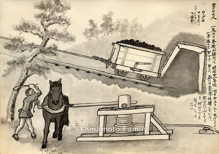 一馬力の巻機が据わった明治丗八年頃 セナやスラであげるより一歩進んだヤマである。函には五百斤(三百㌔)位積んでいた。狸穴式のゴク小々ヤマで何処にでもあったのではないロープは四、又は五分のアエンワイヤロープを使用