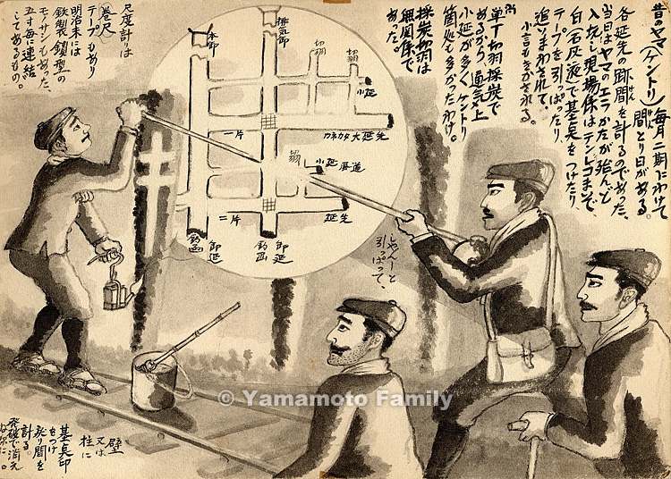 毎月二期にわけて間(けん)とり日がある。各延先の跡間(けん)を計るのであった。当日はヤマのエラかたが殆んど入坑し、現場係はテンテコまいで、白(石灰液)で基点をつけたり、テープを引っぱったり、追いまわされて、小言もきかされる。