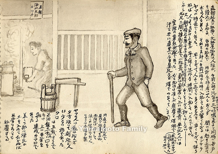 しかし又、朝の繰込の際、今日は病気などと言うても、おーそーかと許しはしないー。九尺二間の棟割長屋で小板葺、冬は寒く夏は暑苦しい上に蚤責め、早入坑の人には実際の暑熱地獄であった。尤も坑内は涼しいが炭塵と煤烟で汗と共に真黒になり鼻孔など煤でつまってしまう。(当時のヤマに南京虫は現今の様に全然おらなかった。)