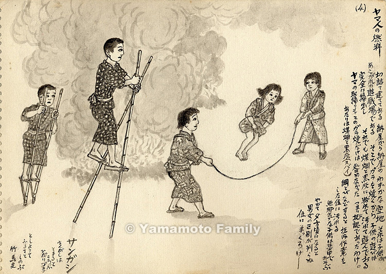 切詰て建ててある納屋から納屋のわずかな空地、それは子供があこがれの遊戯場である。そこでガラを焼くから子供の遊びは完全に締出し、それでも煤烟と黒灰に粉れて汚れて遊んでおる。ヤマの取締りもこのガラ焼だけは咎めなかった。つまり公認であったわけ。あたりは煤烟と黒灰(スバイ)、綱とびなどすると坑内作業をした位に汚れる。無邪気な子供は夢中であそぶ。やがて夕方頃になると男女の区別が判らぬ位にまっくろけー。