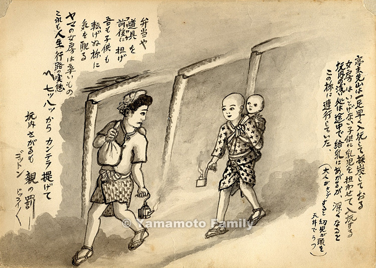 坑内の浅い処は途中で給乳にあがるが、深くなると この様に連行していた