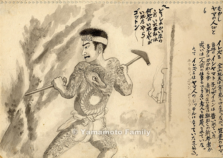 金山坑夫は余り見うけなかったが、筑豊のヤマ、当時のイシヤマト又はゲザイニンは皆いれていた。多少にかかわらず刺青のない者は駈出しの新参者か或いは一人前の仕事もできない素人と軽蔑されていた。よってイレズミはヤマ人のレッテルになっていたのである。