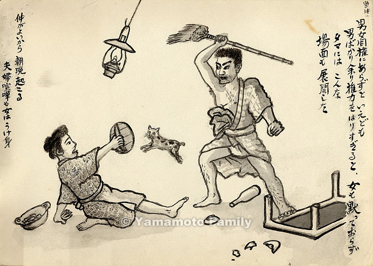 当時は男女同権にあらずといえども、男ばかり余り権力をはりすぎると、女も黙っておらず、タマにはこんな場面も展開した。 仲がよいから朝晩起こる。夫婦喧嘩も女はうけ身。