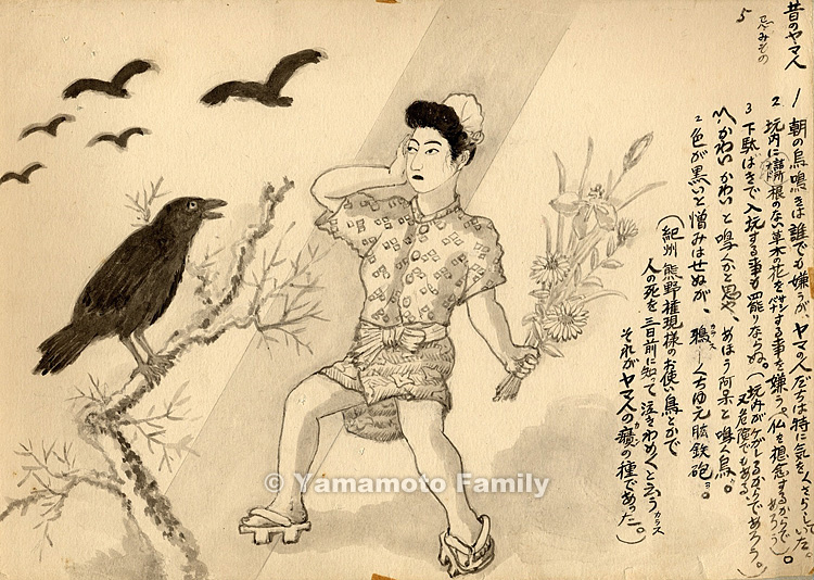 (紀州熊野権現様のお使い鳥とかで、人の死を三日前に知って泣きわめくと云うカラス。それがヤマ人の癪の種であった。)
