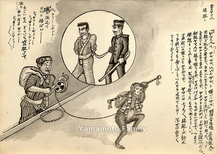 『ヤマの人はハァー サル、サル、いいんサル、と嫌いんサル。』明治三十年頃 広島県人の出稼ぎ坑夫の発言で、当時ユウモラスとしてヤマに流行した詞であった。ヨッテ 童児でもサルと言う事はまかりならず、ヤエンと言わねばドヤサレル(殴)位であった。何故ヤマ人は猿を嫌うたか、それはバクチうちが多いからで、つまり、腰縄をうたれる事、又、去(サル(まける。))を厭うたものであるらしい。それ程いみ嫌うにもかかわれず、ヤマにはチョイチョイ猿廻しが訪れて子供だちを喜こばしていたから皮肉でもあり 浮世は面白くできておるものー。
