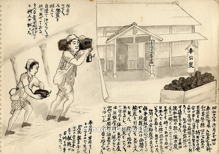 昭和十八年六月二十四日、奉公炭の登場。入坑者は差別なく昇坑の際、必ず一キロ以上の石炭を拾うて持あがる発令が出た(福岡鉱山監督省から)。これは愛国心昂揚のためであろう。