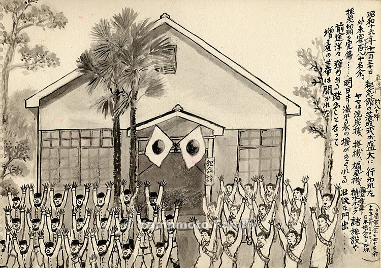 外来客だけでも百八十名余(愛国婦人会も四十名余、十七年三月三十日ヨリ日本婦人会と改称)。ヤマは洗炭機、捲機、煽風機、輸送電車、排水ポンプ、諸施設や採炭切羽も完備……、明日より溢れる水の堰がきられる壮快な門出……。前途洋々、弾力ある踏出しとなって増産の幕は開かれたー。