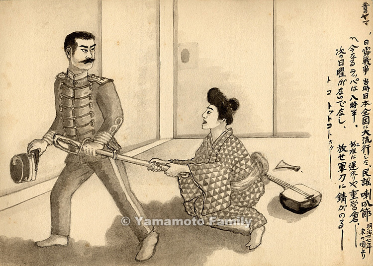 昔のヤマ ラッパ節 日露戦争当時、日本全国に大流行した民謡喇叭節、明治丗七年末頃より。 ~今なるラッパは八時半、あれに遅れりゃ重営倉ー、次の日曜がないでなし、放せ軍刀に錆がのるー、トコトットコトー。