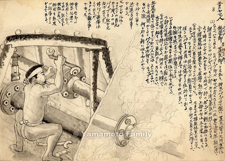 たまさかの採炭休業日に基ストップをとめて修繕方が総員でかゝる。但し他の工員も応援する。握るスパナー、工具は火傷する位灼けておる。汗は流れ尽きて褌まではずすものが多い。勿論手拭(タオル)も邪魔になる。いかなる豪傑でも二十分間位で手をあげる。