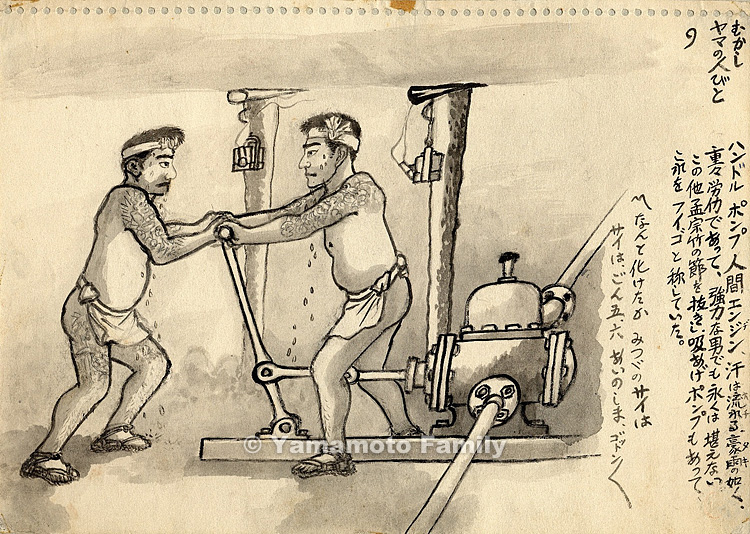 ハンドルポンプ人間エンジン、汗は流れる(おちる)、豪雨(タキ)の如く、重々労働であって、強力な男でも永くは堪えない。この他 孟宗竹の節を抜きし吸いあげポンプもあってこれをフイゴと称していた。〽なんと化けたか みつづのサイは サイはごん五、六あいのしま、ゴットン ゴットン