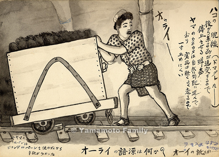 ハコの脱線(ドマグレたー)後から来る函が追突するので停止させる叫声・・・・・ヤマのカネカタは自然に勾配に延んでおり 実函は軽くよく走るので一寸止めにくいオーライの語源は何か? オーイの訛りか―― ラを入れはずみをつけたか小ヤマのカタバンはジョンドにペーシを使わぬから事故が多かった。